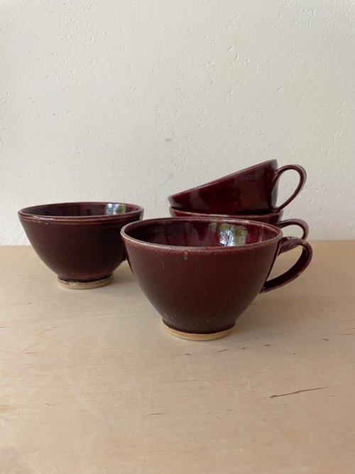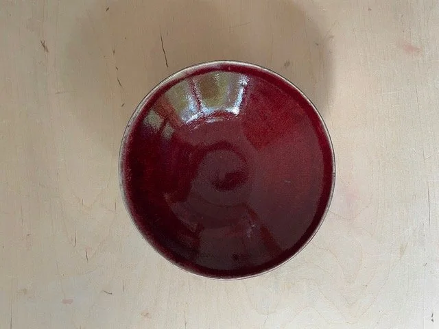 Det är inte alltid lätt att hitta den rätta balansen för reduktion, hur mycket gas jag sätter fyr på, och om glasyren inte blir tillräckligt reducerad så blir den grön eller blå. Den kan alltså användas i en elektrisk ugn, men då blir den inte röd. Dessutom så kan skålar i samma bränning visa olika resultat beroende på var i ugnen de har stått. Men här stod nu 6 koppar i en klarröd perfekt oxblodsglasyr. Hjärtat slog några extra slag. En av kopparna hade slagit sig lite så den gick bort. Jag hade också några kaffekoppar, fina men inte perfekt oxblod, en liten burk och en skål, stor som en pastaskål med perfekt glasyr.