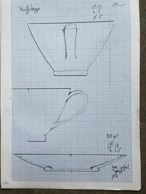 En massa olika modeller. Varje modell har sina mått och sin mängd lera. Och jag gör samma misstag hela tiden. Jag skriver aldrig upp vad jag har gjort. Några saker kommer jag ihåg. Min stora tekopp har 420 gram lera. Den är 9 cm hög och 15,5 cm i diameter – nydrejad. Och pastaskålen har 1200 gram lera. Den skall vara 25 cm i diameter upptill och 14 cm i diameter i botten. Och 7 cm hög. Sen krymper min lera, potclays 1109, ca 12%.